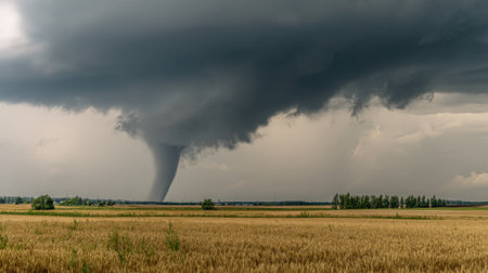 A powerful tornado forms in an open field, surrounded by dark clouds. The image captures the sheer energy and beauty of nature's fury, highlighting the chaotic elements of a storm.