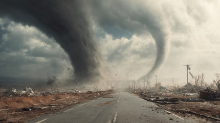 Two massive tornadoes form in the background, causing devastation to the landscape and a dirt road. Dark clouds swirl above, indicating severe weather and destruction.