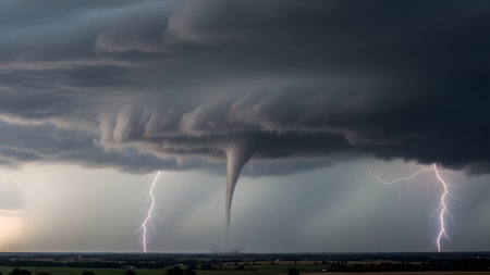 A massive tornado funnels down from a dark, swirling supercell thunderstorm over a rural landscape. Bright bolts of lightning flank the twister, emphasizing the dangerous power of this severe weather event.