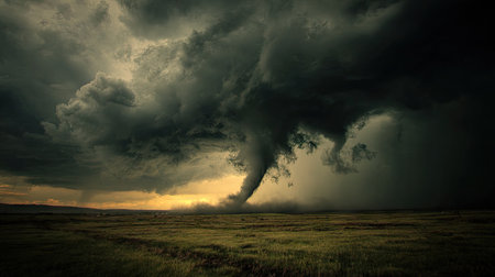 A powerful tornado descends from dark clouds, swirling with intensity amidst a tranquil rural field. The setting sun casts a warm glow, enhancing the dramatic atmosphere. Generative AI.