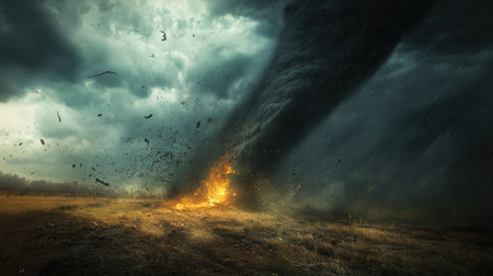 Powerful tornado sweeps through a fiery landscape, creating a breathtaking and terrifying scene of nature's fury, marked by dark storm clouds and swirling winds.