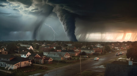 A large dangerous tornado approaching residential buildings, dangerous natural phenomena