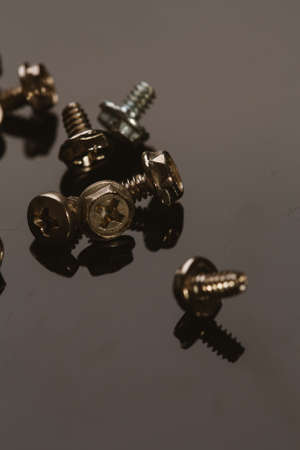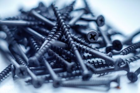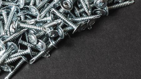 Construction fasteners. Self-tapping screws are scattered in a disorderly heap on a dark background. Excellent design for advertising construction fasteners