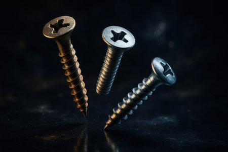 Three shiny metal screws with phillips heads stand vertically on a dark, reflective surface. industrial hardware for construction, repair, and DIY projects, highlighting precision and strength.