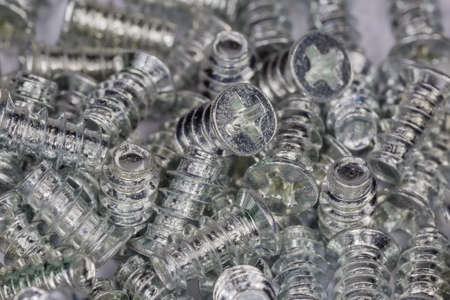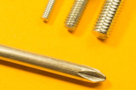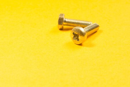 Group of Screw bolts for furniture assembling on yellow background. Stock photo.