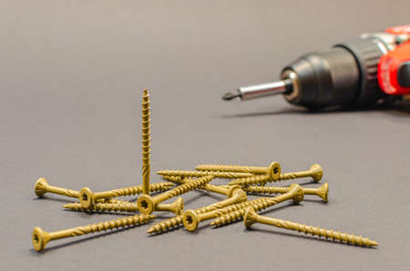 Self-tapping screws on the background of a battery screwdriver, a selection of different self-tapping screws on a black background