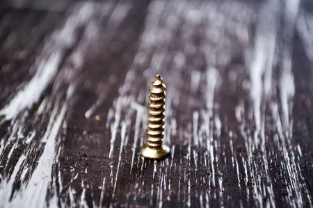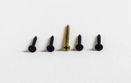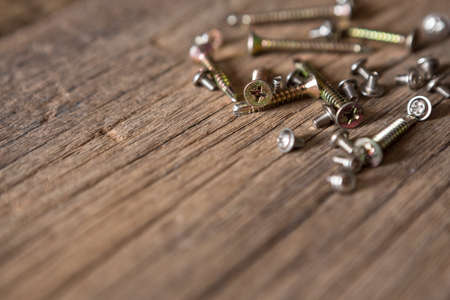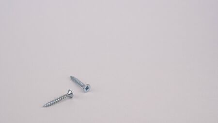 Metal tapping screws for wood on white wooden background. Construction equipment concept. Copy, empty space for text.