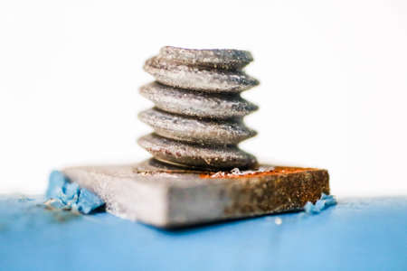 Close up selective focus of rusty screws. old steel bolts on grungy white wood background