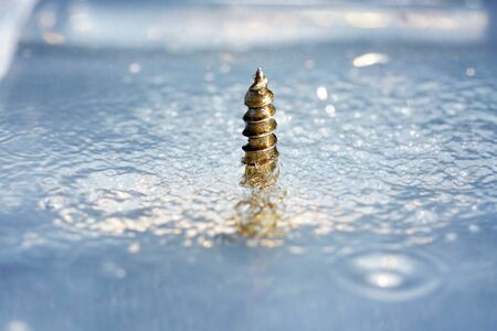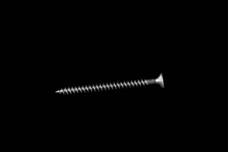 An isolated screw placed on a reflective surface with a dark background. Selective focusing