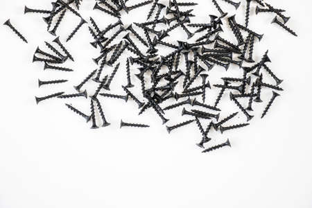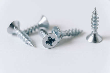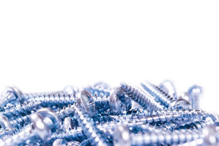 Self tapping metal screw isolated on white background. Macro shot of a self-tapping screws. Background of the screw. Self drilling fasteners. Steel bolts pattern. Tools for work