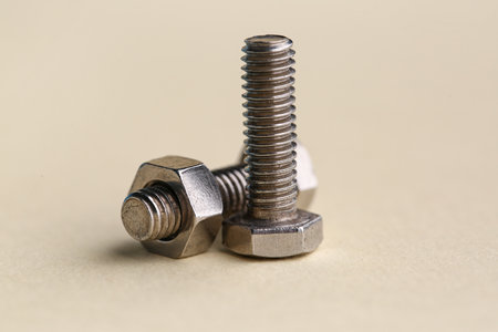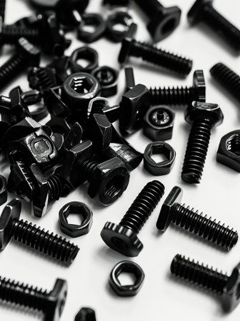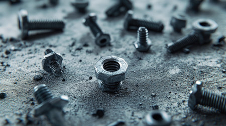 This close-up image features a collection of metallic nuts and bolts scattered across a textured surface, highlighting the intricate details of industrial hardware.