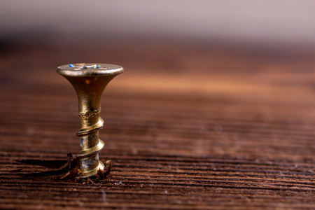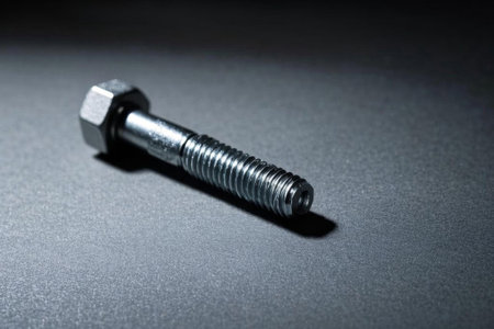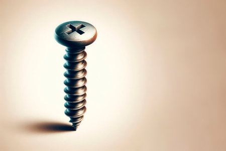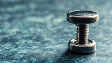 A captivating close-up of a single metal screw resting on a dark, textured surface. Soft lighting enhances the intricate details and reflections, showcasing the screw's design and craftsmanship. Perfect for industrial and hardware themes.