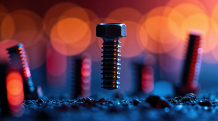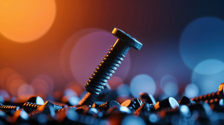 A close-up macro shot of a single tilted screw standing among scattered bolts, illuminated by dramatic orange and blue bokeh lights, creating an industrial atmosphere.