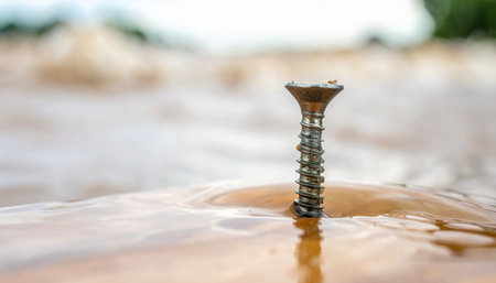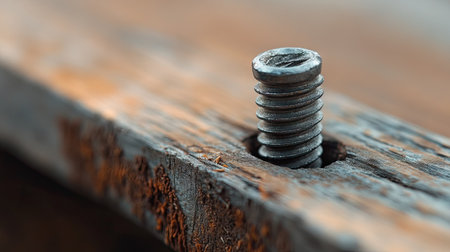 An extreme close-up of a screw embedded in wood, with the threads tightly gripping the surface, showing fine details of the material.