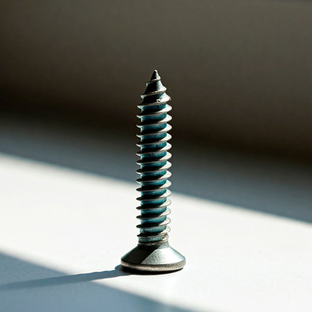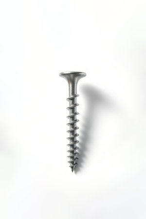 This image features a detailed close-up of a silver metal screw placed on a textured surface. The lighting creates interesting shadows and highlights, showcasing the craftsmanship and sleek design of the object.