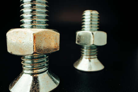 Range Rusty old screws bolts nuts. Grunge metal Hardware details dark nackground