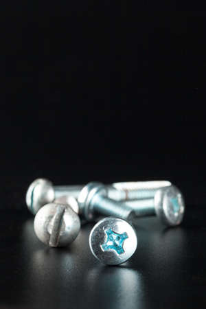 Silvery four bolts and pile screws on grey. Left upright bolt right light.
