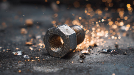A metal bolt lies on a dark surface with sparks flying from nearby activity creating an energetic scene.