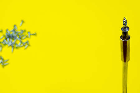 A set of screwdriver nozzles and a screwdriver on a yellow background with space for copyspace text. Tools for construction and repair shop.