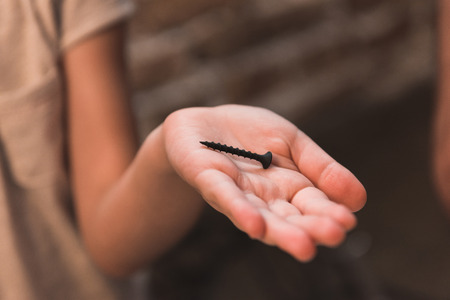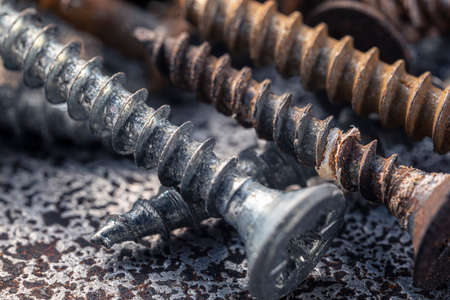 A handful of old self-tapping screws covered in dirt and rust. Screws macro photo. Construction abstraction. Industrial background.