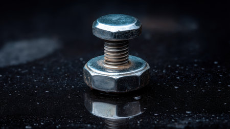 A close-up image of a metal bolt and nut showcasing intricate details and reflections on a dark surface with water droplets. Perfect for industrial themes.
