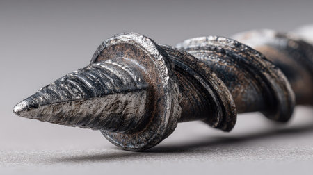 This close-up image captures the intricate details of a rusty metal screw, showcasing its threaded design and pointed tip against a smooth gray background.