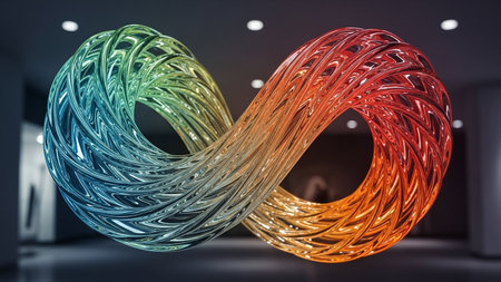 An infinity symbol made of colorful transparent twisted material glows with light and reflections in a room.