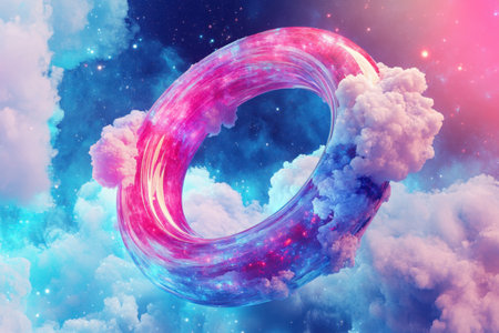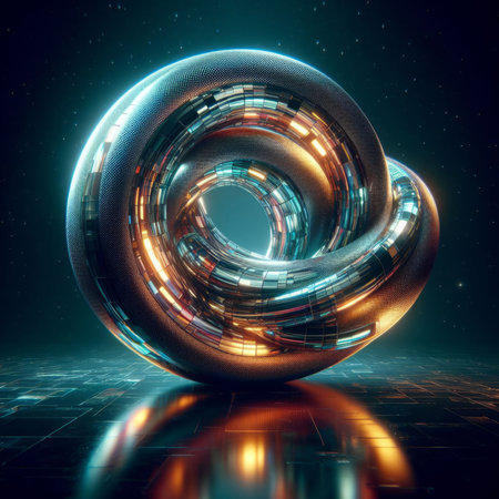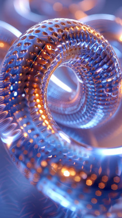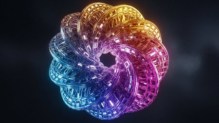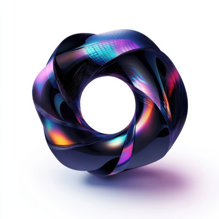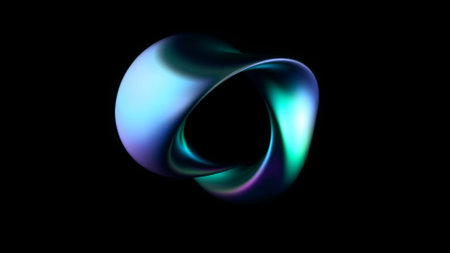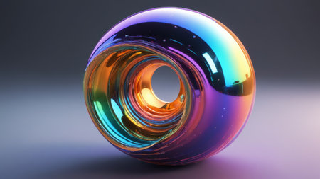 With showing intricate metallic torus shape with rainbow gradient lighting against a dark starry background. resolution