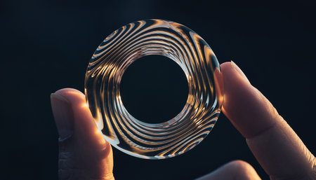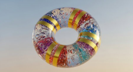 A colorful, transparent ring floats on a blue surface