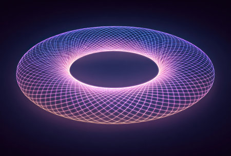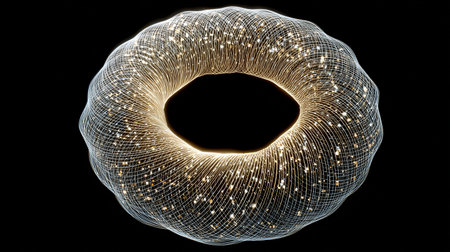 A glowing, three-dimensional torus, rendered with a wireframe pattern, on a dark background