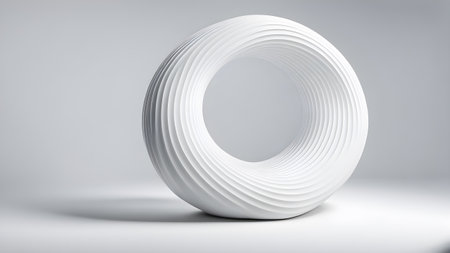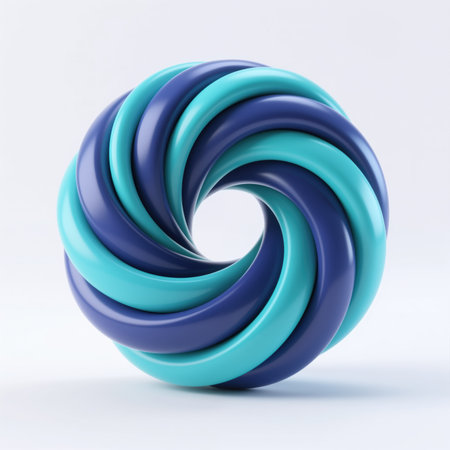 A 3D rendered abstract torus shape with swirling, layered segments in light blue and white.