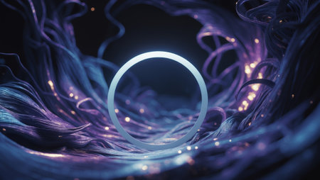 Unique abstract composition featuring glowing strands and a luminous ring in a dark environment