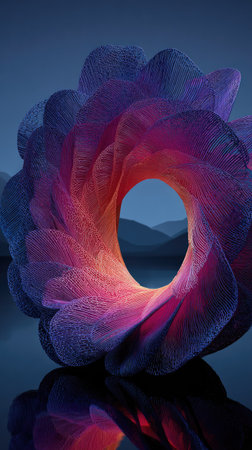 An abstract, floral-like form is reflected on a calm surface, possibly water. The image presents a complex interplay of purple, pink, and orange hues. The detailed construction and lighting create a mesmerizing visual experience. It can be used for artistic, design, or commercial projects.