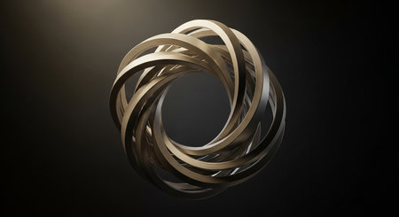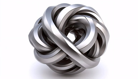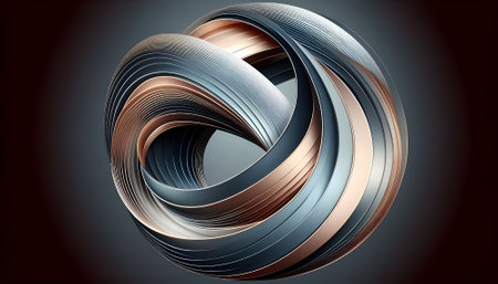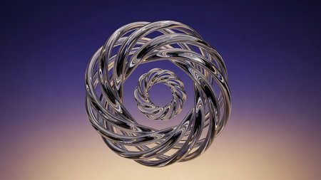 A complex spiral design is presented against a gradient backdrop. The metallic artwork showcases interwoven lines creating a symmetrical, three-dimensional form. The lighting highlights the smooth textures, contrasting with the soft background. This visual could be useful for a variety of designs or abstract concepts.