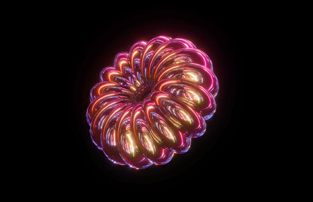 Abstract Geometric Form With Glowing Center and Delicate Curves in Neon Colors on Blue Background