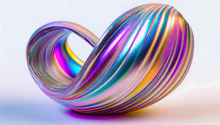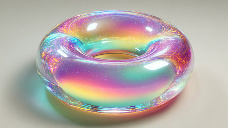 A vibrant and colorful abstract ring sculpture is showcased against a minimalist background, emphasizing its smooth texture and brilliant reflections.