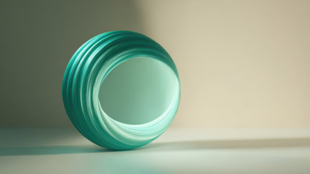 A round, teal object sits on a flat surface. Light casts soft shadows around it. The design shows smooth curves and a reflective surface. The background is light-colored and simple.