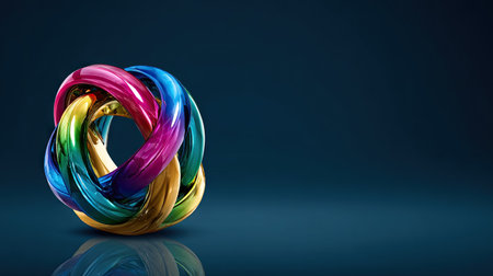 A vibrant image presents a set of interlocked rings in a spectrum of colors. The glossy textures reflect light against a deep blue backdrop. This conceptual artwork suggests themes of collaboration and interconnectedness. It is suitable for diverse commercial and editorial applications, offering a modern aesthetic.