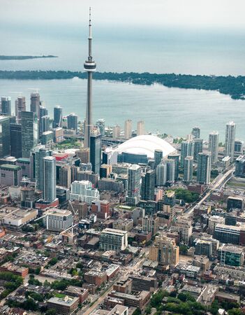 An aerial view of Toronto's skyline showcasing the city's towering skyscrapers and urban landscape.