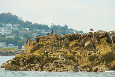 Cormorant dries its wings. The birds dries its plumage in the sun. The coast of the sea. A flock of sea birds on the rocky coastline of Dublin, Ireland.