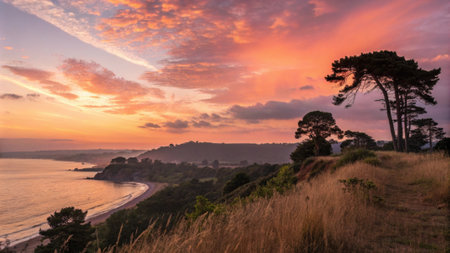 As twilight approaches the sky transforms into hues of orange and pink casting an enchanting glow over the scene..