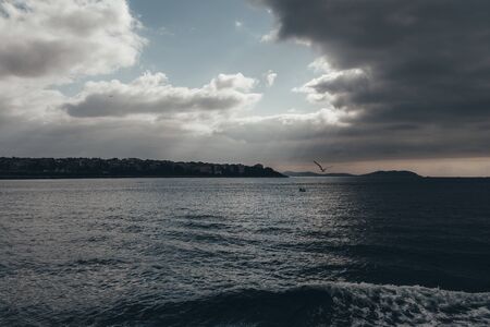 A seagull on a dark cloudy sky in the rays of the setting sun over the sea with a boat on the background of mountains and sideways with buildings of Istanbul, Turkey. Beautiful evening night seascape