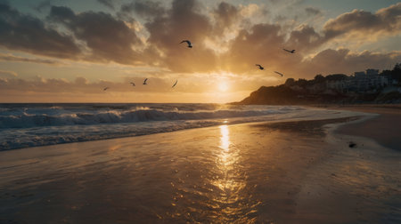 A beautiful sunset scene at the beach with ocean waves, sandy shore, golden light and birds flying in the sky. The sun sets behind the clouds with a dramatic sky, reflecting on the water and sand.
