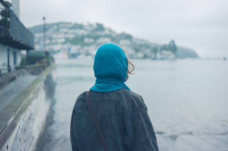A young woman is standing by a slipway waiting for the ferry