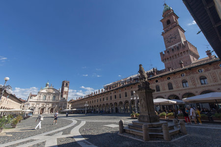 Vigevano, Italy - August 30, 2020: street view of the medieval main square in Vigevano during daylight.