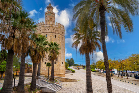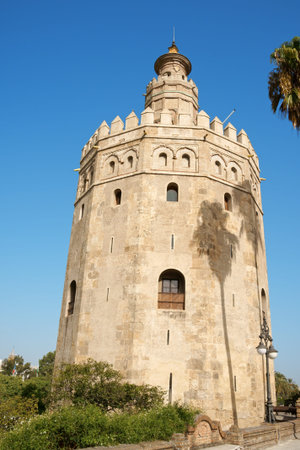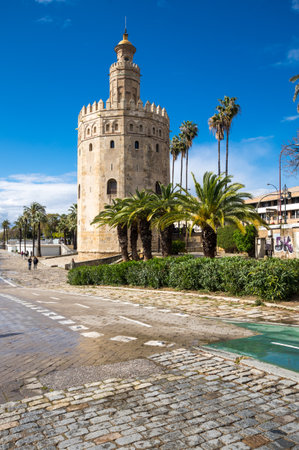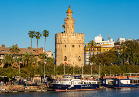 Seville, Spain - 28 March 2025: Tower of Gold (Torre del Oro) on Guadalquivir river embankment