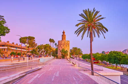 SEVILLE, SPAIN - SEPTEMBER 29, 2019: The dusk over the riverside area with palm trees and medieval Torre del Oro (Golden Tower) at the bank of Guadalquivir River, on September 29 in Seville