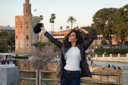 Young beautiful black woman with afro hair dressed in casual clothes is in Seville, Spain. The woman is happy and smiling enjoying the sights the city has to offer during her holiday.