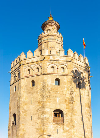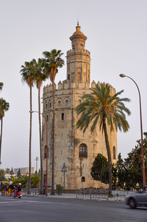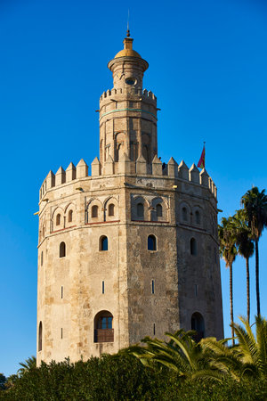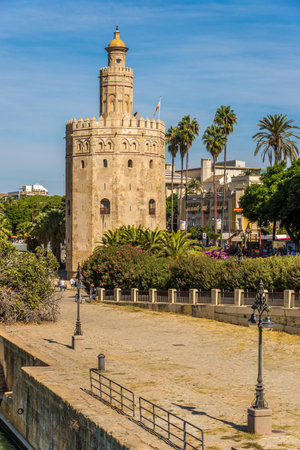SEVILLE, SPAIN - OCTOBER 1, 2019: Torre del Oro (Golden Tower) is a Moorish tower on the bank of Guadalquivir river is one of the main tourist landmarks of the city, on October 1 in Seville