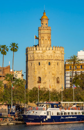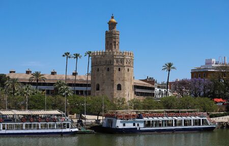 SEVILLE, SPAIN - 06 APRIL, 2019: View of Guadalkivir river and Torre del Oro, historical limestone Tower of Gold in Seville, a big tourist center in Spain